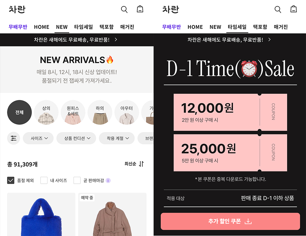D-10일부터 의류 사진에 표기가 되기 때문에 구별하여 보시기 편하십니다. 메뉴 중 타임세일에 가셔서 판매마감이 임박한 상품들을 모아서 보실 수 있습니다. 하루에도 여러번 다운 받아서 사용할 수 있는 타임세일 쿠폰이 있습니다. 2만원 이상 12,000원 할인 / 5만원 이상 25,000원 할인 받을 수 있는 쿠폰입니다.
