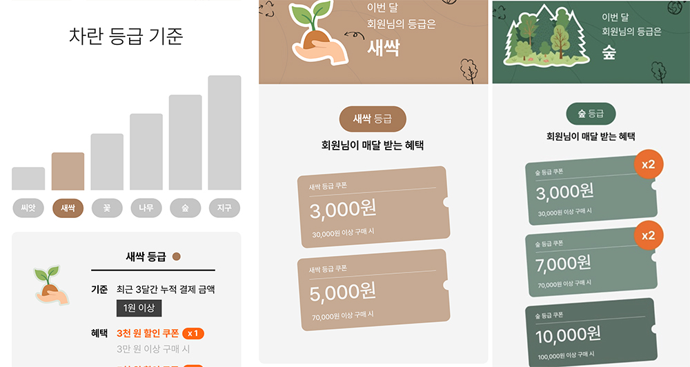 차란에는 처음 가입하면 씨앗- 1원 이상 구매시 새싹이 됩니다. 3만원 이상 구매시 3,000원 할인 쿠폰 / 7만원 이상 구매시 5천원 할인 쿠폰을 줍니다. 구매금액에 따라 차란 등급이 나누어지고 등급에 따른 쿠폰이 매달 발급됩니다. 옷을 자주 구매하게 되면 그에 맞는 혜택이 주어지게 되니 의류에 관심이 많으신 분들에게는 좋은 것 같았습니다.