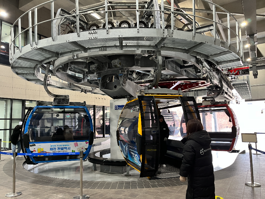 10분을 이동하긴 하지만, 그래도 높은 곳에 올라가니 화장실에 다녀오는 게 좋겠지요? ^^ 볼일을 보고 케이블카를 타러 갔습니다. 안내를 따라 이동하였습니다. 청풍호반 케이블카는 일반형과 크리스탈 두 가지가 번갈아가면서 옵니다. 줄은 나뉘어 있어서 한팀씩 차례로 입장하게 됩니다. 일반형은 줄이 긴 편이지만 크리스탈형은 금방 탈 수 있습니다. 아무래도 가격차이가 나서 그런 것 같습니다.