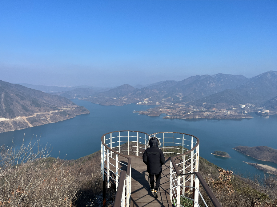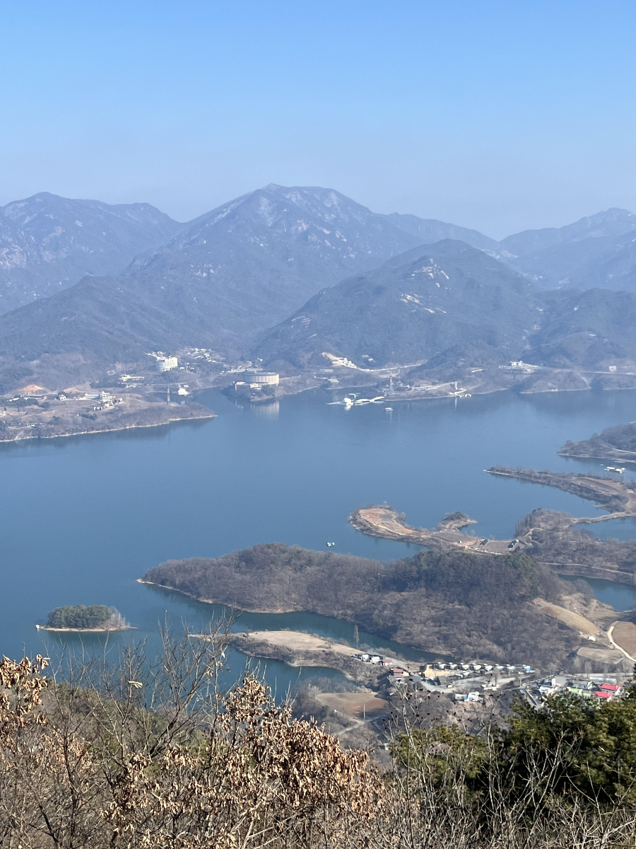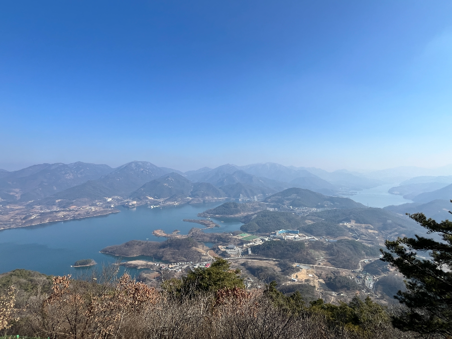 멀리 청풍호 풍경이 보였습니다. 너무 맑은 물색이 사진에 담기지 않아서 아쉬울 정도였습니다. 정말 아주 예쁜 물빛에 감동했습니다. 우리나라가 이렇게 아름다운 곳이었다니!! 마구 감탄을 하면서 올라갔습니다.