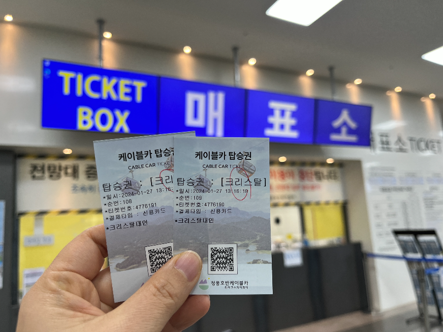 청풍호반 케이블카는 주차장이 꽤 넓어서 주차하는데 어려움은 없었습니다. 매표소는 건물 1층인데 계단을 올라가야 해서 2층 같은 느낌이었습니다. 매표소에서 상담원에게 탑승권을 구매해도 되고 키오스키를 사용하셔도 됩니다. 저희는 줄이 없는 틈을 타서 상담원에게 빠르게 구매를 했습니다.