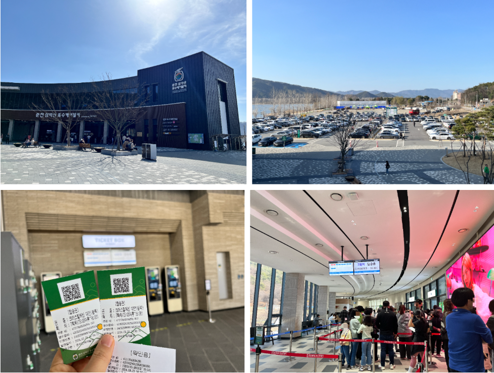 규모가 꽤 큽니다. 주차장도 넓고 주차장 근처는 호수를 따라 산책할 수 있도록 되어 있습니다. 저희는 탑승권을 미리 네이버 예약을 통해 구매를 했습니다. 티켓은 키오스키에 예약정보를 입력하시면 시간을 한번 더 선택하고 탑승권과 확인증이 나옵니다.