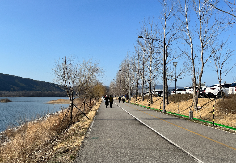 내려와서 주차장 옆 쪽에 산책길을 구경했습니다. 잔잔한 호수가 꽤 매력적이었습니다. 한 1~2주만 지나도 초록초록하니 예쁠 것 같습니다. 강원도라 그런지 지난 주말에 다녀왔는데 날은 꽤 많이 따뜻해졌는데 사진 속에는 겨울 느낌이 많이 남아있었습니다. 금세 포근해질 것 같습니다.