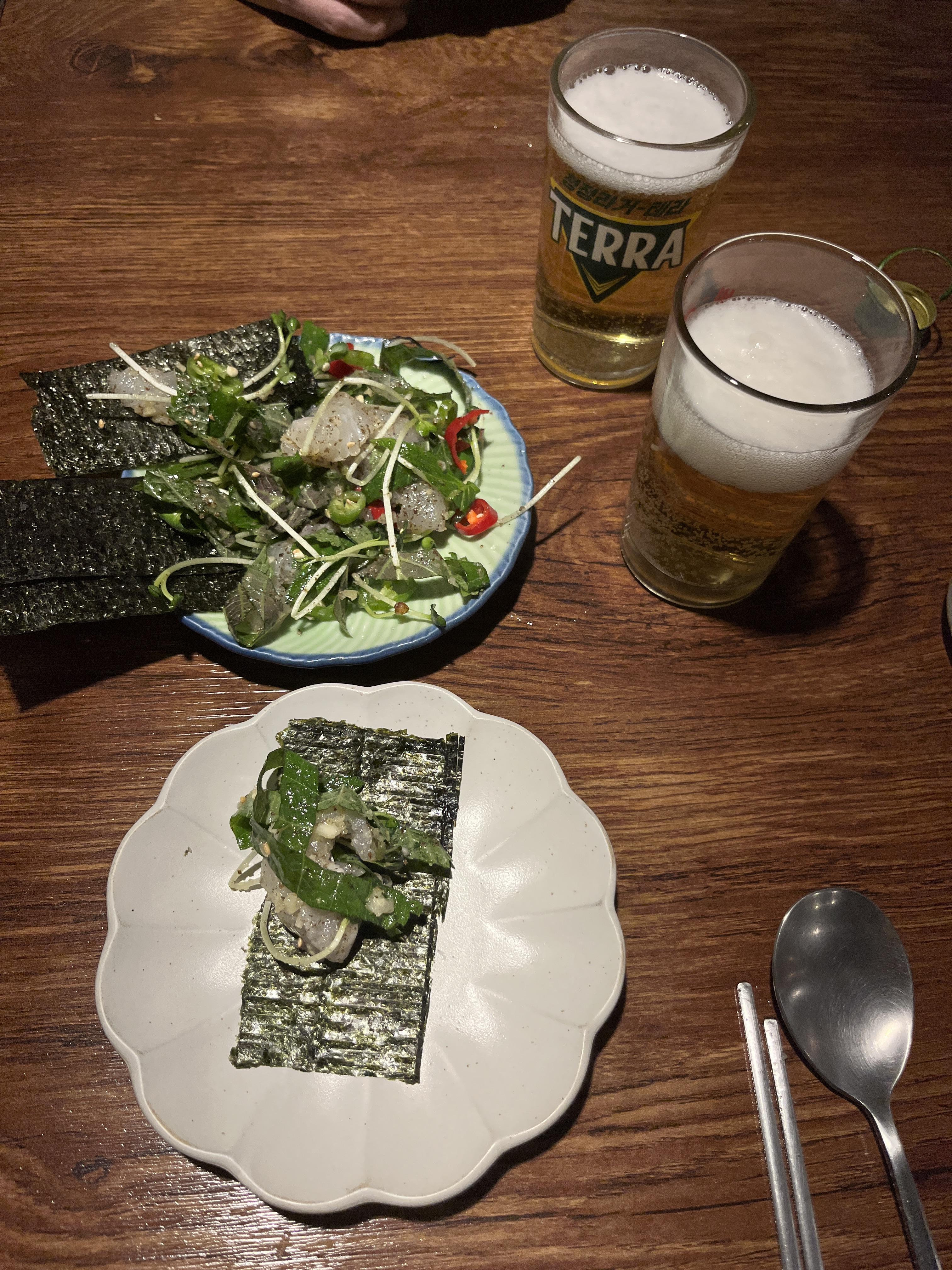 애피타이저로 나온 이름은 잘 모르겠지만, 도다리가 아닐까 하는 추측을 했습니다. 쫄깃쫄깃 너무 맛있었습니다. 역시 우린 해물파입니다. 누가 배부르다고 그랬나요? 메뉴 고를 때는 엄청 고심해서 아롱사태도 못 먹고 감자전도 못 먹고... 어쩌고 저쩌고 고민을 많이 했지만, 입으로 쏙쏙 들어가 버렸습니다. 참 맛있게 먹었습니다.