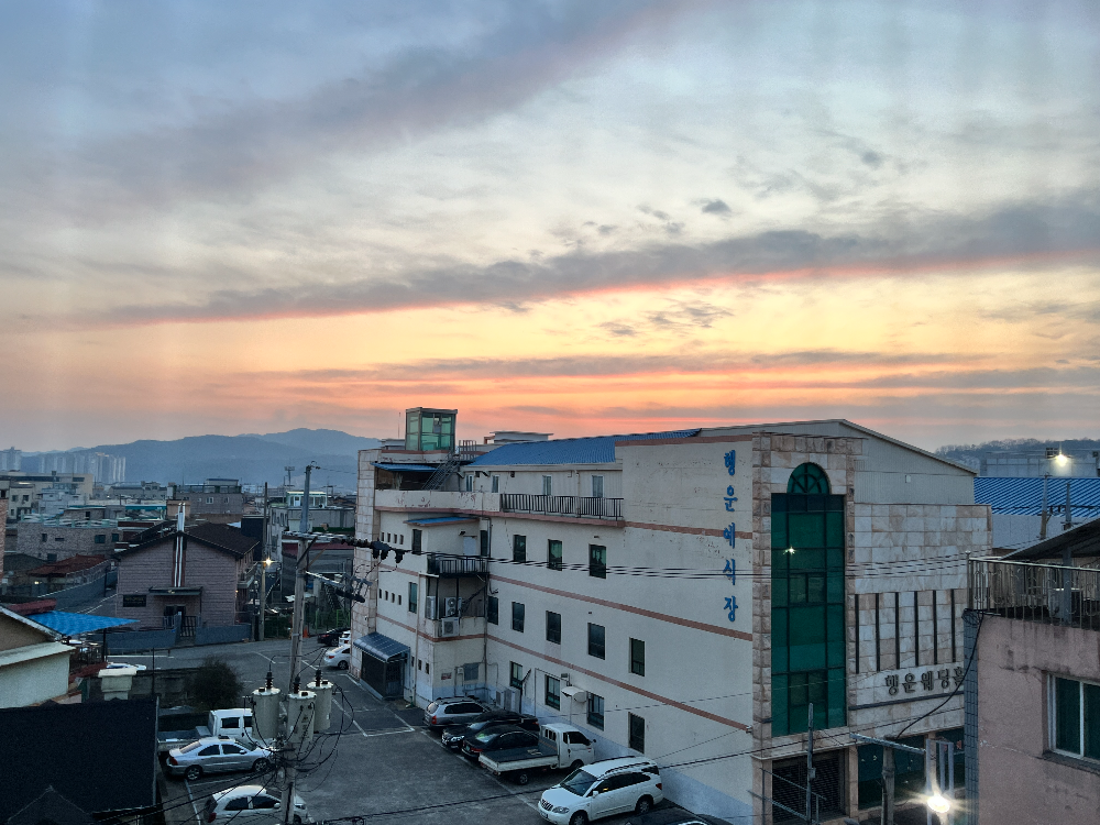 창문을 열어 바깥에 보여지는 풍경을 감상했습니다. 해가 예쁘게 지고 있었습니다. 건물이 고층이 아니기 때문에 엄청난 풍경이 펼쳐지는 것은 아니지만, 그래도 좋았습니다.