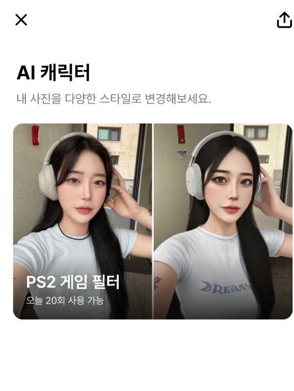 AI 캐릭터 만들기는 그림 같은 이미지로 사진을 변환해줍니다. 현재 PS2 게임필터 한가지만 있습니다. 오늘은 20회 사용할 수 있다고 합니다. 아무 사진이나 골라서 클릭해주면 사진이 그림같은 느낌으로 나오는데 결과물이 저는 별로였습니다.