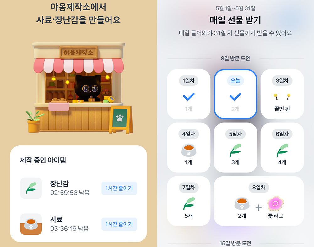 출석체크로 받던 사료는 사라지고 제작중인 아이템으로 변경되었습니다. 비슷한듯 다른 형태입니다. 만들기를 누르면 제작되는 시간이 나오게 됩니다. 시간이 지난 후 완성이 되면 받고 다시 제작을 들어갈 수 있습니다. 시간을 줄이기 위해서는 광고를 보면 됩니다.