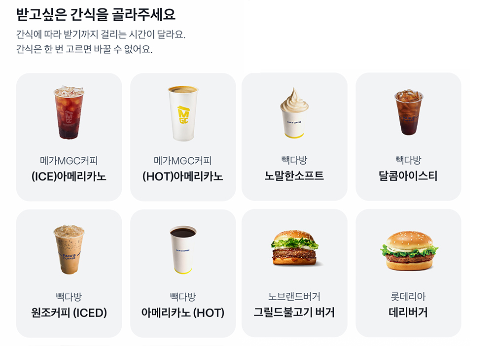 간식에 따라 받는 시간이 다르다고 합니다. 레벨 4 단계가 되면 다른 레벨에 비해 시간이 조금 지루한 느낌이 드는데 간식에 따라 특별히 다른 느낌은 없었습니다. 그러니 편안하게 원하시는 브랜드콘을 고르시면 될것 같습니다. 대신 다른 메뉴로 교환이 안될수 있으니 메뉴를 보시고 정확하게 고르시면 됩니다. 대신 중간에 변경이 불가능하니 잘 선택해주세요.