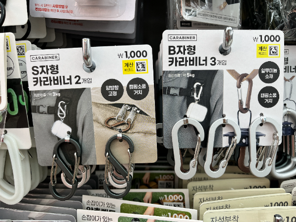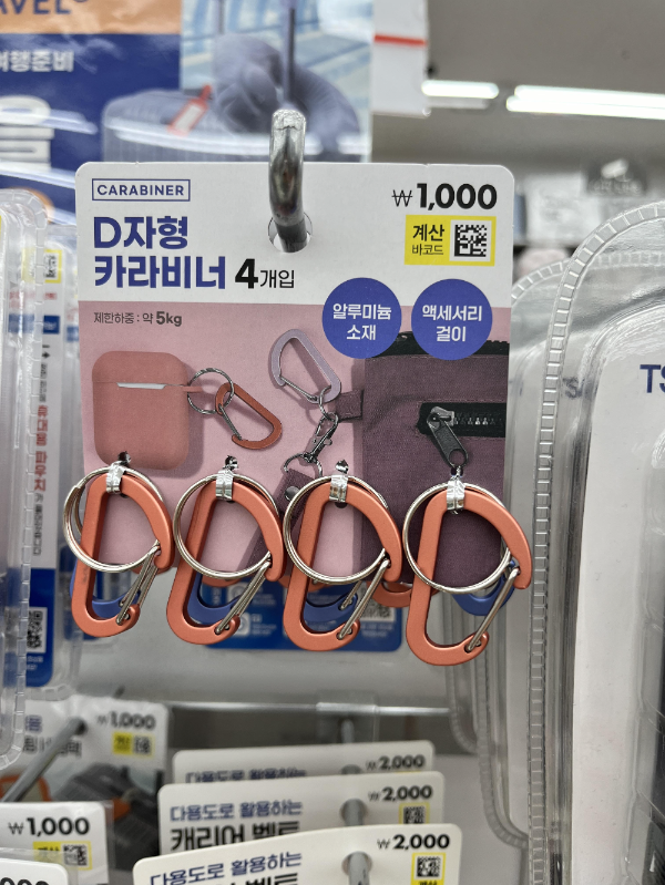 짐을 잃어버리지 않도록 연결해 줄수 있는 카라비너입니다. 저는 동전지갑을 카라비너로 가방에 연결해 두었습니다. 혹시 손에서 떨어뜨려도 대롱대롱 매달려 있기 때문에 안심할 수 있을 것 같습니다. 작은 소품들을 따로따로 많이 챙겨가신다면 한 곳에 연결해 두어도 좋을 것 같습니다. 여행할 때 외에도 일상에서도 사용하기에 충분하기 때문에 하나쯤 있으셔도 좋습니다.
