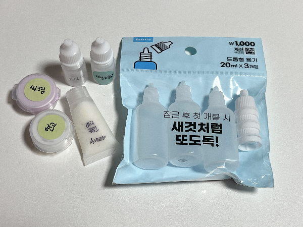 다이소에는 정말 많은 휴대용품들이 있습니다. 그중에 제가 해외여행뿐 아니라 국내여행에서도 자주 사용하는 것들입니다. 다양한 형태의 일회용기들이 있습니다. 원하는 크기와 유형에 잘 맞추어서 구매하시면 됩니다. 저는 한 번 쓰고 버릴 것들은 원형으로 된 용기를 사용합니다. 뚜껑이 열릴 것 같은 불안함이 있어서 여러 번 사용하지 않습니다. 드롭형 용기는 처음 개봉할 때는 새것처럼 뚜껑을 열고 사용하게 됩니다. 세럼이나 오일 같은 화장품류를 넣어서 사용하고 있는데 새지 않아서 좋습니다. 샴푸나 치약은 조금 큰 사이즈로 구매하여 찾아보기표를 붙여주어서 사용하고 있습니다. 여행일정이 길다면 고체형 치약을 준비하셔도 좋습니다.
