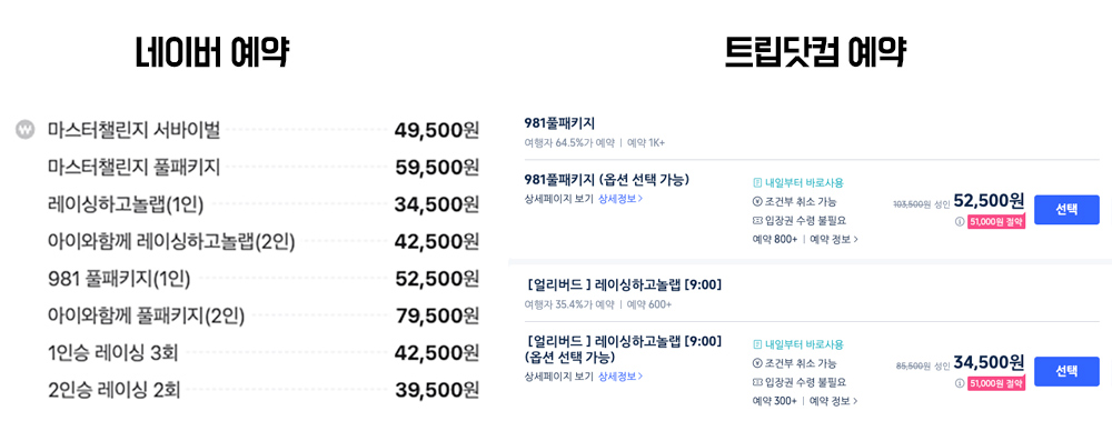 예매는 네이버 예약사이트와 트립닷컴에서 비교해 보았습니다. (가격은 변동이 있으니 예매 전 꼭 확인해 주세요) 981 풀패키지에 경우 약 50% 정도 할인된 가격으로 예매가 가능했습니다. 이외에도 야놀자에서도 할인된 가격으로 예매하실 수 있으니 평소에 많이 사용하시는 곳에서 예매하시면 좋을 것 같습니다.