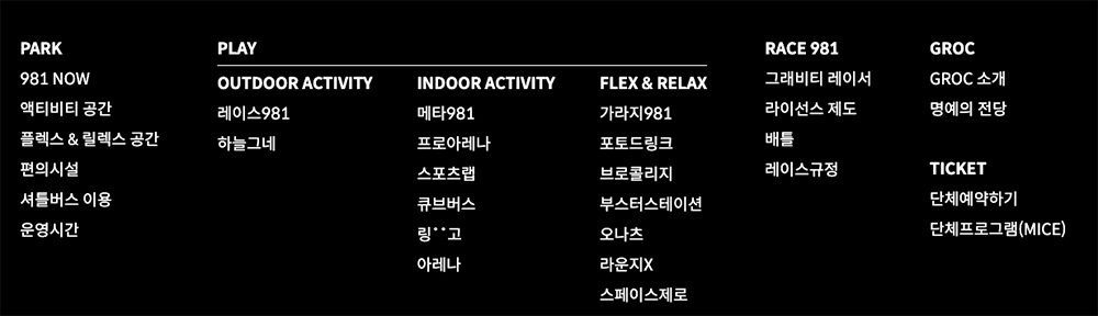 981 파크 홈페이지에 가시면 PLAY 카테고리에서 즐길거리를 확인하실 수 있습니다. 실외(Outdoor Activity)와 실내(Indoor Activity)로 나눠져 있습니다. 다양한 체험을 좋아하시는 분들은 홈페이지에서 즐길거리를 확인하시고 예매를 하시면 좋겠습니다.