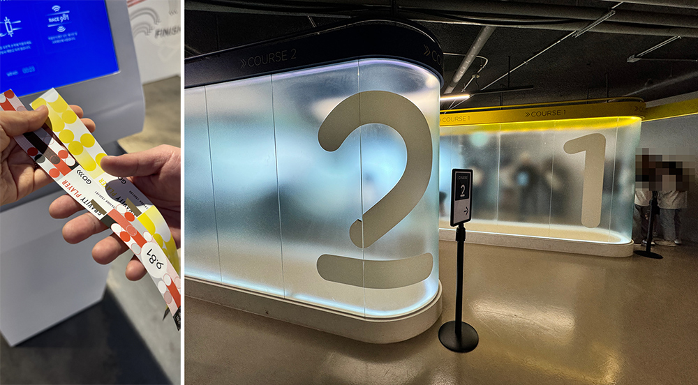 미리 예약을 하지 않으신 분들은 키오스크를 이용하여 직접 현장 발권을 받기도 했습니다. 저는 티켓팅 데스크에서 입장권을 발급받았습니다. 손목에 두르는 형태로 된 입장권이었고, 뒷면에 기계를 인식할 수 있는 부분이 있었습니다. 간혹 뒷면에 있는 인식센서가 잘 인식되지 않을 때가 있으니 손목에 잘 감싸주시면 좋겠습니다.