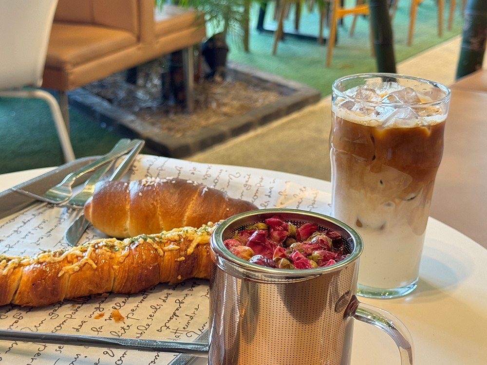 저는 장미차와 라떼, 그리고 가벼운 빵을 골랐습니다. 점심 먹은 지 얼마 되지 않아서 케이크는 조금 부담스럽기도 해서 시그니처 메뉴들은 다음기회로 넘겼습니다. 장미차에는 장미가 가득 들어있어 받았을 때부터 기분이 좋았습니다. 은은하게 우러나오는 장미향도 좋았습니다.