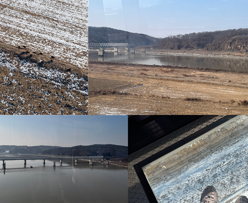 곡식을 먹는 새들도 귀엽게 보이고, 넓은 들판과 임진각이 어우러진 풍경들, 그리고 두 개의 유명한 다리를 보실 수 있습니다. 케이블카 바닥이 투명한 크리스탈 캐빈은 하늘에 떠 있는 느낌이 조금 들었습니다. 케이블카를 타고 DMZ 존으로 도착합니다.