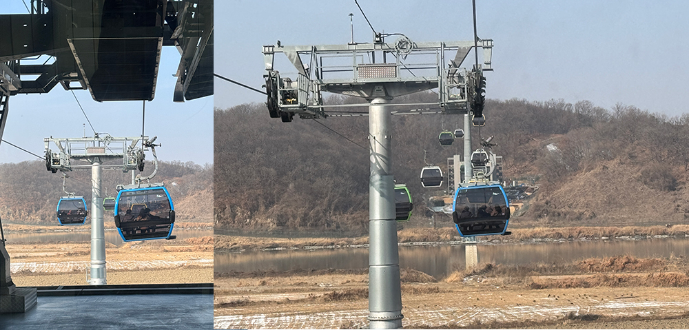 다른 지역의 케이블카보다 거리는 짧은 편이었습니다. 겨울이라 초록초록하지 않은 아쉬움이 있었지만, 날이 따뜻해지기 시작하면 강과 함께 어우러지는 풍경이 너무 예쁠 것 같았습니다. 경의중앙선 임진강역 하차 후 도보로 산책하실 수 있습니다. 곤돌라는 약 7분 정도 탑니다.