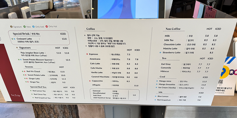 메뉴판이에요. 시그니처 음료, 커피, 논 커피 메뉴로 구성되어 있어요. 가격에 뷰 감상비가 포함되어 있는 것 같았어요. 조금 후달달달 ㅎㅎㅎ 빵까지 주문하고 나니, 웬만한 밥값보다 더 많이 나왔어요. 요즘은 밥값보다 카페에서 지출하는 비용이 더 많은 느낌이에요.