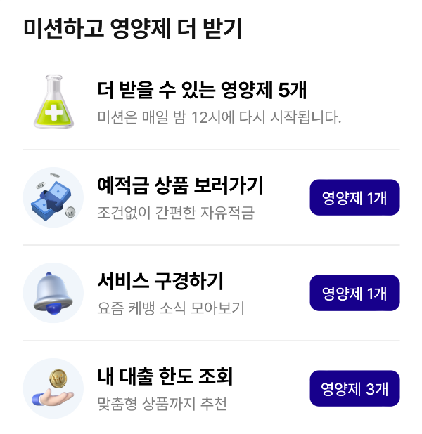 하루에 받을 수 있는 영양제는 총 5개입니다. 저는 내 대출 한도 조회를 제외하고 두가지를 매일 해주고 있습니다. 버튼을 누르시면 관련 내용을 둘러보실 수 있습니다. 시간적인 제약 같은 것은 없습니다. 해당 페이지를 보시고 오시면 바로 영양제가 지급되어 있습니다. 그래서 저는 물 1번 주고, 영양제 2개를 매일 주고 있습니다.