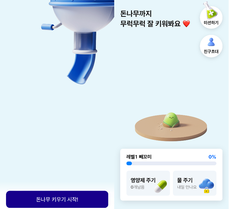 돈나무 키우기를 시작하면 씨앗 하나가 배달이 됩니다. 레벨 1은 씨앗형태의 빼꼬미 입니다. 키우는 방법은 물 주기와 영양제 주기입니다. 물 주기는 하루에 한 번 하실 수 있고, 무조건 지급되고 있습니다. 추가로 물 주기를 하면 경험치와 함께 1원이 입금됩니다. 영양제 주기는 미션을 수행해야 받을 수 있습니다. 미션은 케이뱅크의 광고를 보는 것입니니다.