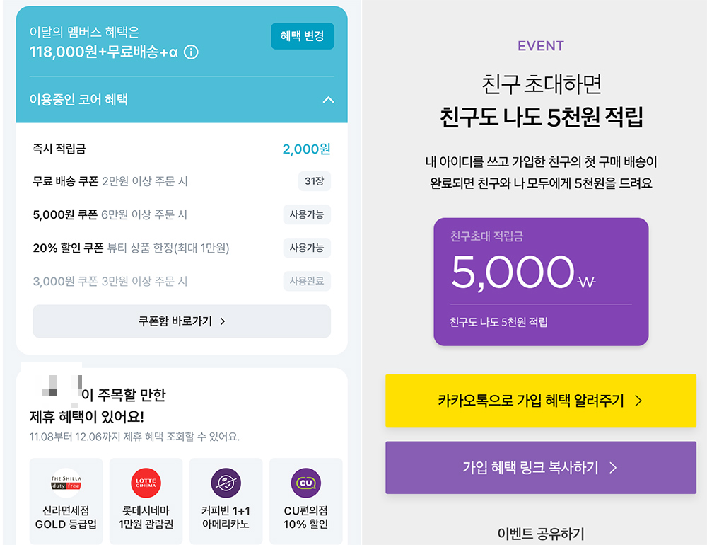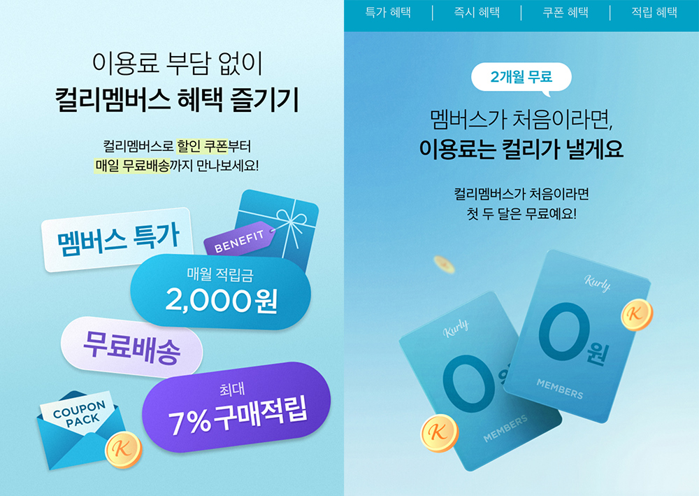 컬리 멤버스를 구독하시면 매달 2,000원의 적립금을 주기 때문에 사실 구독료 1,900원이 없는 셈입니다. 컬리멤버스 해택을 매일 업데이트되는 멤버스 특가를 누릴 수 있습니다. 매월 적립금 2,000원을 받고, 무료배송과 쿠폰팩을 선택할 수 있습니다. 구매 적립률은 최대 7%이며, 영화관, 카페, 편의점 쿠폰 및 할인 해택을 누릴 수 있습니다.