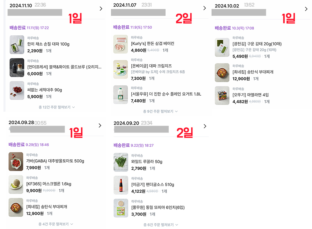 5번의 주문 기록을 모아보았습니다. 추석 명절에도 배송을 해주어서 바로 다음날 받아보았습니다.