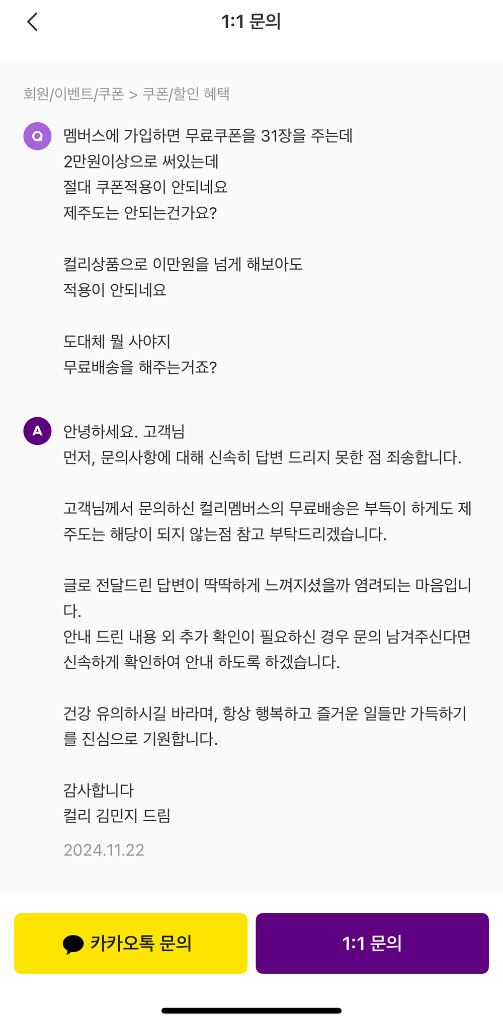 대신 제주도의 경우 2만원이상 무료배송이 해당하지 않기 때문에 이 점은 참고해주시길 바랍니다. 저도 처음에는 무료배송이 가능할줄 알고 시도해보다 안 되서 고객문의에 글을 남겼는데 ㅠㅠ 아쉽게도 제주도는 아직 해당되지 않는다고 합니다.