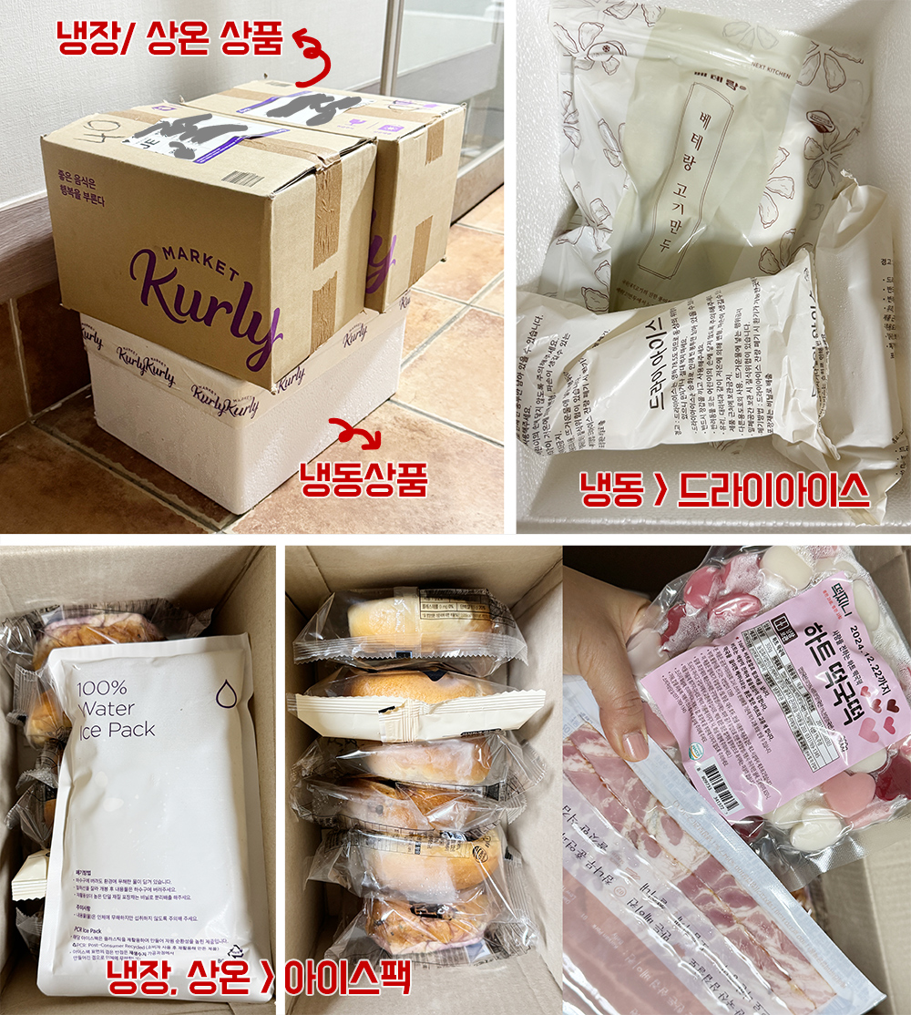냉동상품은 아이스박스에 담아져 오고, 냉장상품과 상온상품은 종이박스에 담아져 옵니다. 냉동상품은 1개만 주문하더라도 드라이아이스 2 봉지가 들어 있습니다. 냉동상품은 하나도 해동되지 않았습니다. 냉장상품과 상온상품은 아이스팩에 담겨 옵니다. 100% 물이기 때문에 녹으면 물을 버리고 비닐로 분리수거하시면 됩니다.