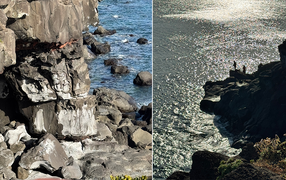 인디언 추장의 모습이 자연적으로 생겼다고 합니다. 어디있는지 숨은 그림 찾기를 해보세요! 저는 윗부분 가운데 있는 부분의 얼룩이 추장의 라인 같아 보였습니다. 자연이 만든 무늬로 꽁꽁 숨어있으니 찾아보는 재미를 느껴보세요. 제주도 절벽에는 항상 낚시하시는 분들이 많이 있습니다. 어떻게 갔는지 신기할 정도지만, 그래도 풍경은 참 멋있었습니다.
