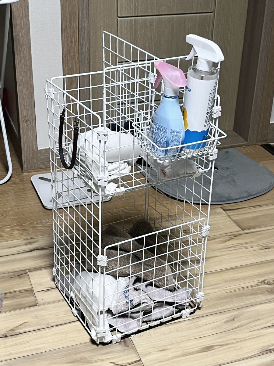 사이 홈도 만들어주고 네트망에 수납을 도와줄 바구니도 함께 구매했습니다. 빨래망을 2단으로 나누기 위해 구멍에 틈을 만들어주었습니다. 이동을 원하신다면 바퀴를 달아주시면 됩니다. 바퀴 크기도 다이소에 다양하게 있기 때문에 원하시는 것을 골라서 구매해주시면 됩니다.